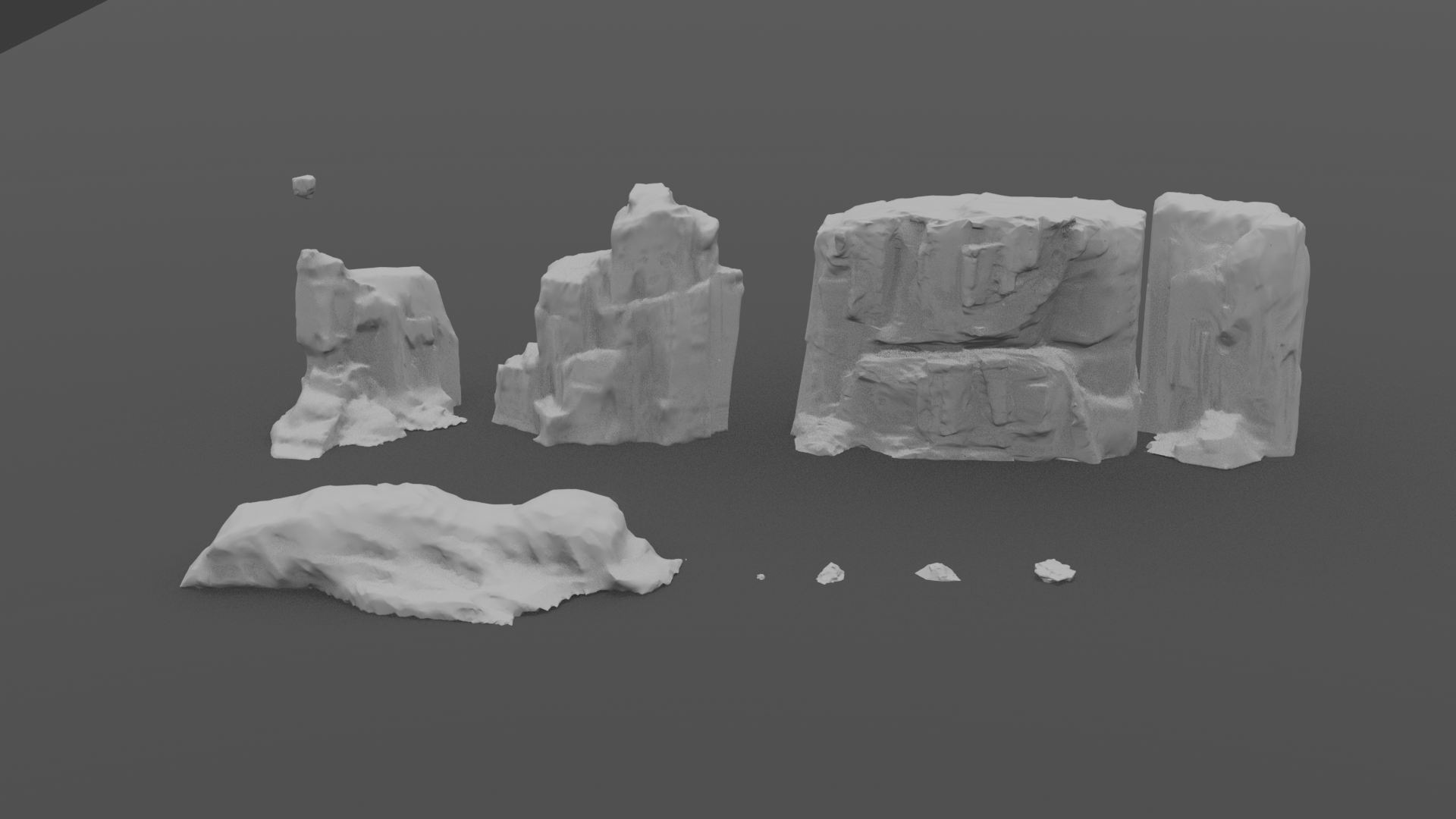 Assets I roughly modelled in Blender. They didn’t need to be this detailed for projection in Nuke, but I want to try out the remesh and sculpting features in Blender.